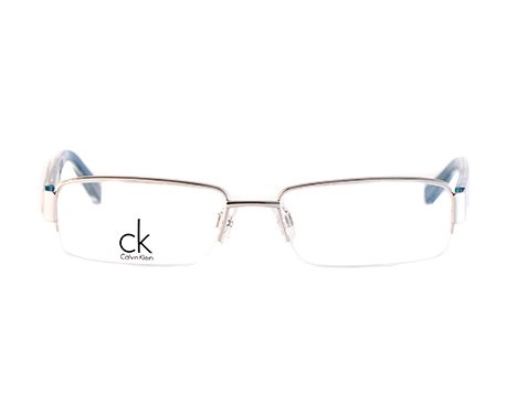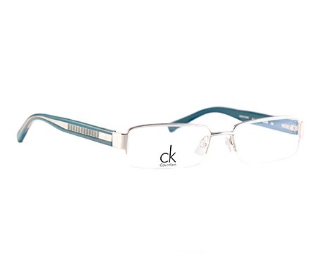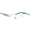 Rimless Bottom designer frame with silver front and aqua blue temples with metal logo detailing.