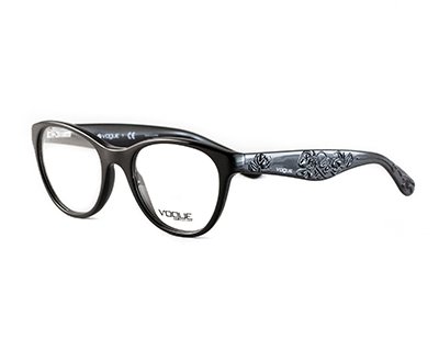 Gorgeous, black, full-rimmed plastic frame with beautiful, engraved floral design on the plastic temples.